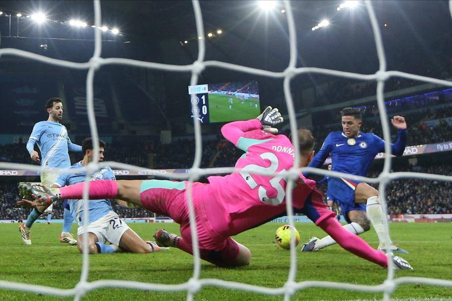 虽然赖因德斯的进球还是为曼城取得了领先,但意外却接踵而来。下半场,迪亚兹和格瓦迪奥尔接连受伤下场,两大主力中卫全部挂彩,曼城最终还是未能顶住切尔西最后时刻疯狂反扑——多纳鲁马竭尽全力也无法阻挡恩佐读秒阶段禁区内3连击。